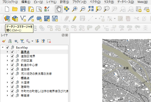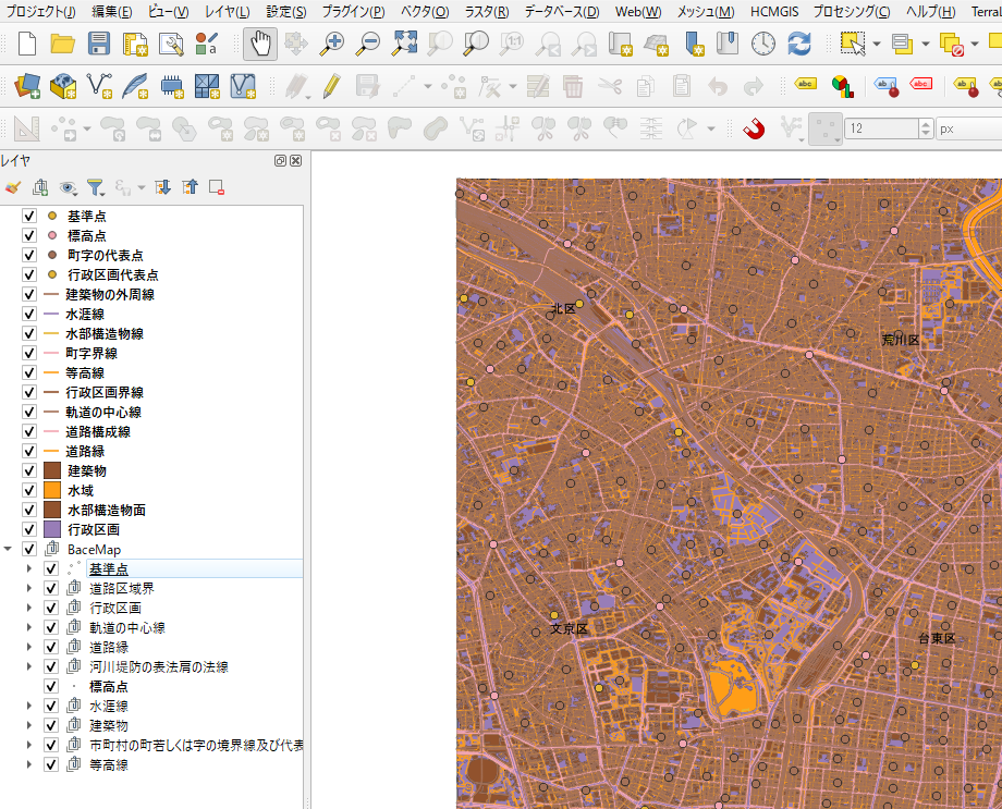 下図は、基盤地図情報をシェープファイルに変換しベースマップに整えた画像になります。