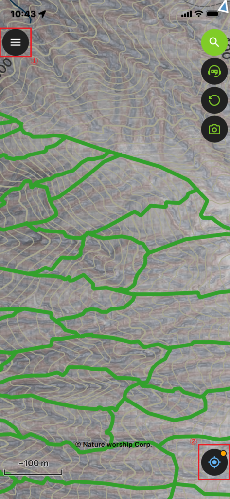 ②現在地を表示したい時は右下の『ターゲット』ボタンを押します。