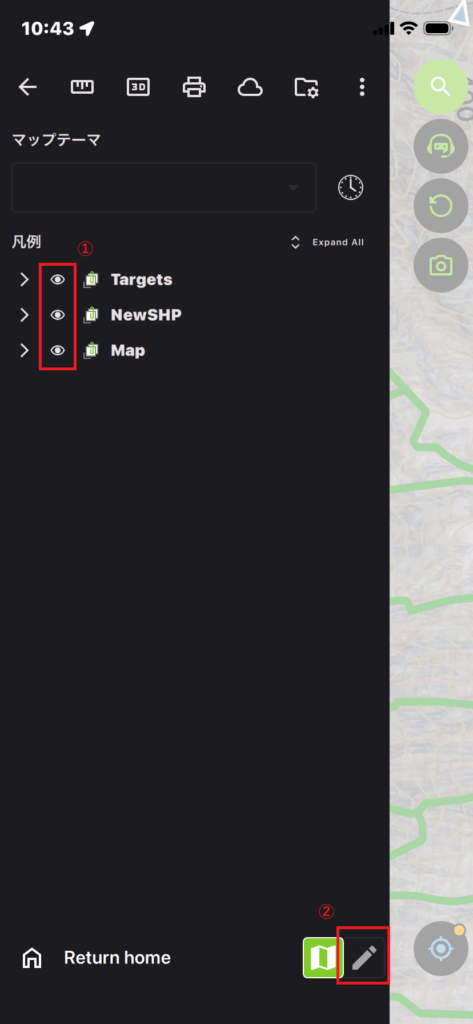 ①メニューを開きたい時は、左上の『メニュー』ボタンを押します。レイヤの一覧が確認できます。