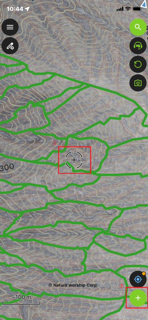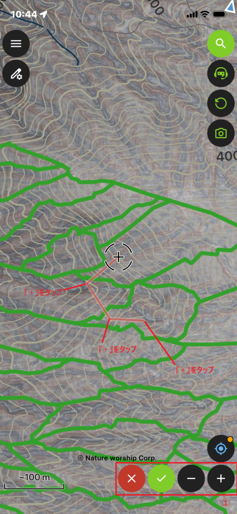 が表示されます。②『+』ボタンを押せば、中央の①座標カーソルの位置にポイントを落とします。
