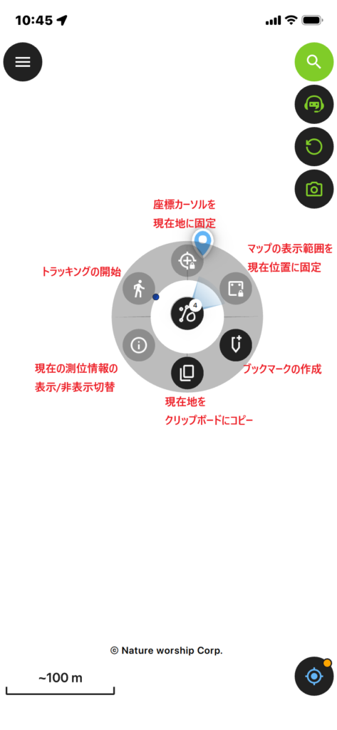 - 現在の測位情報の表示/非表示切替:座標や標高などの情報の表示/非表示を切り替えます。