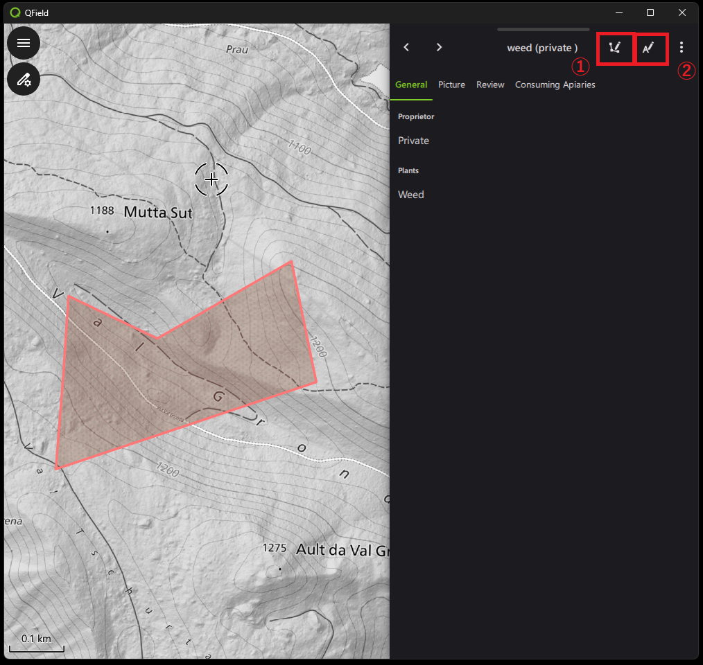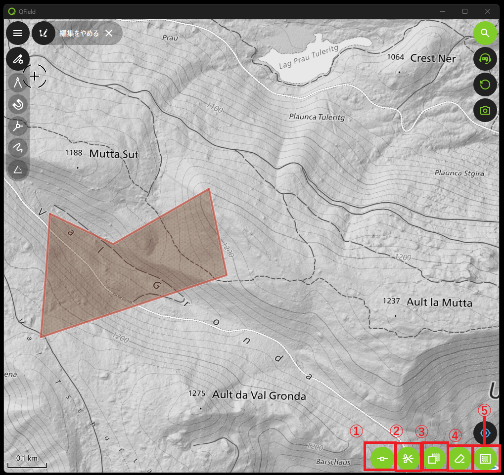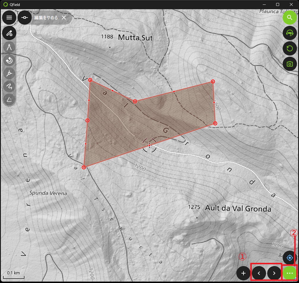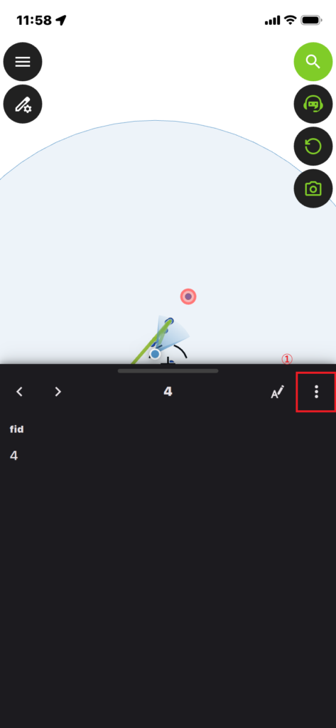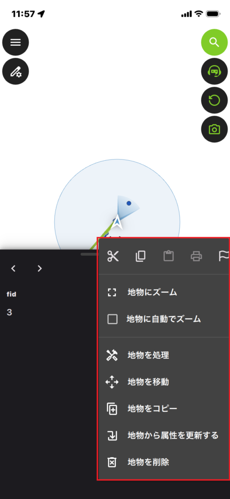 編集モードで地物を選択し、画面下部に出てくる右上の①三点リーダーをタップすると、編集用のメニュー画面を呼び出せます。